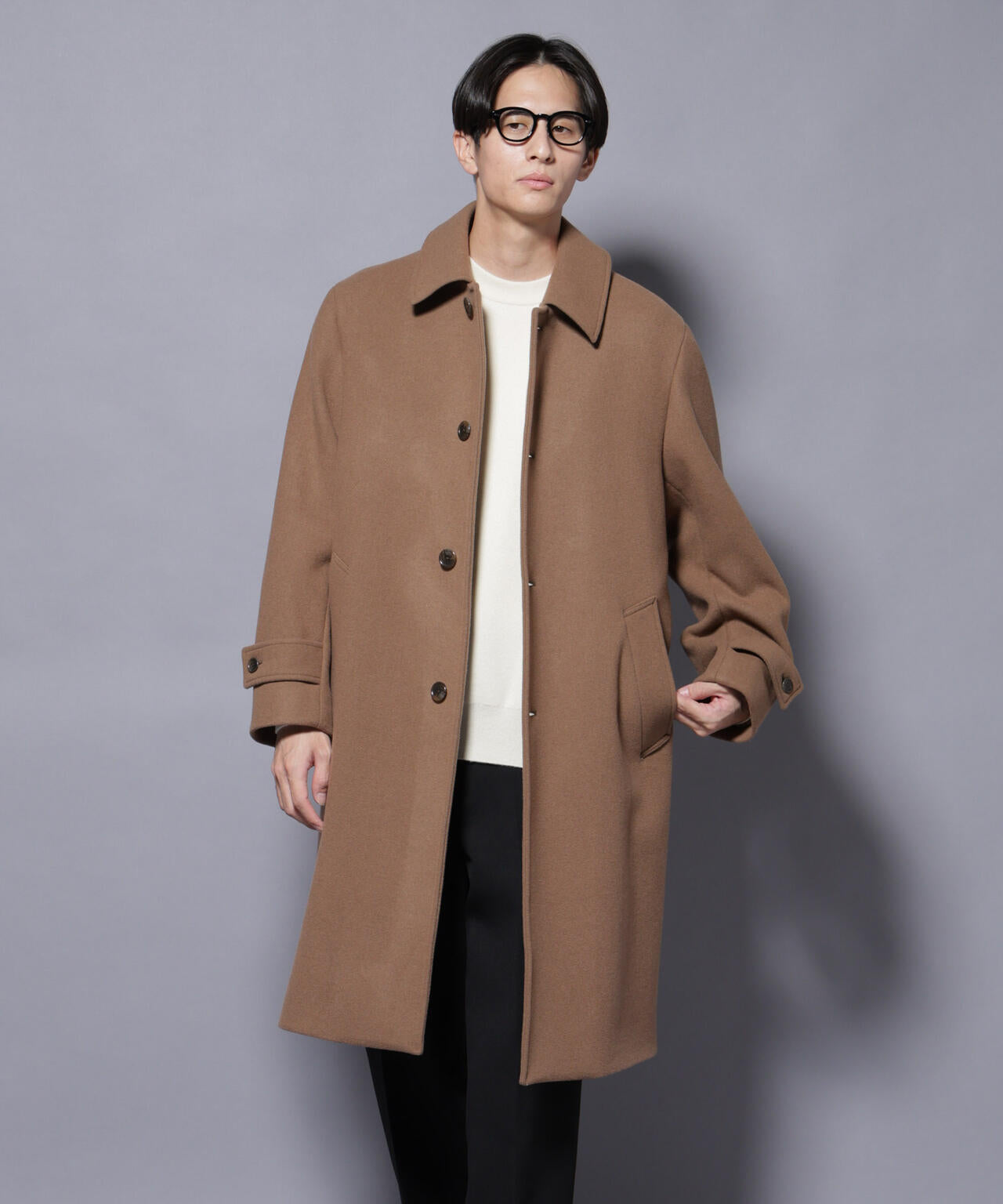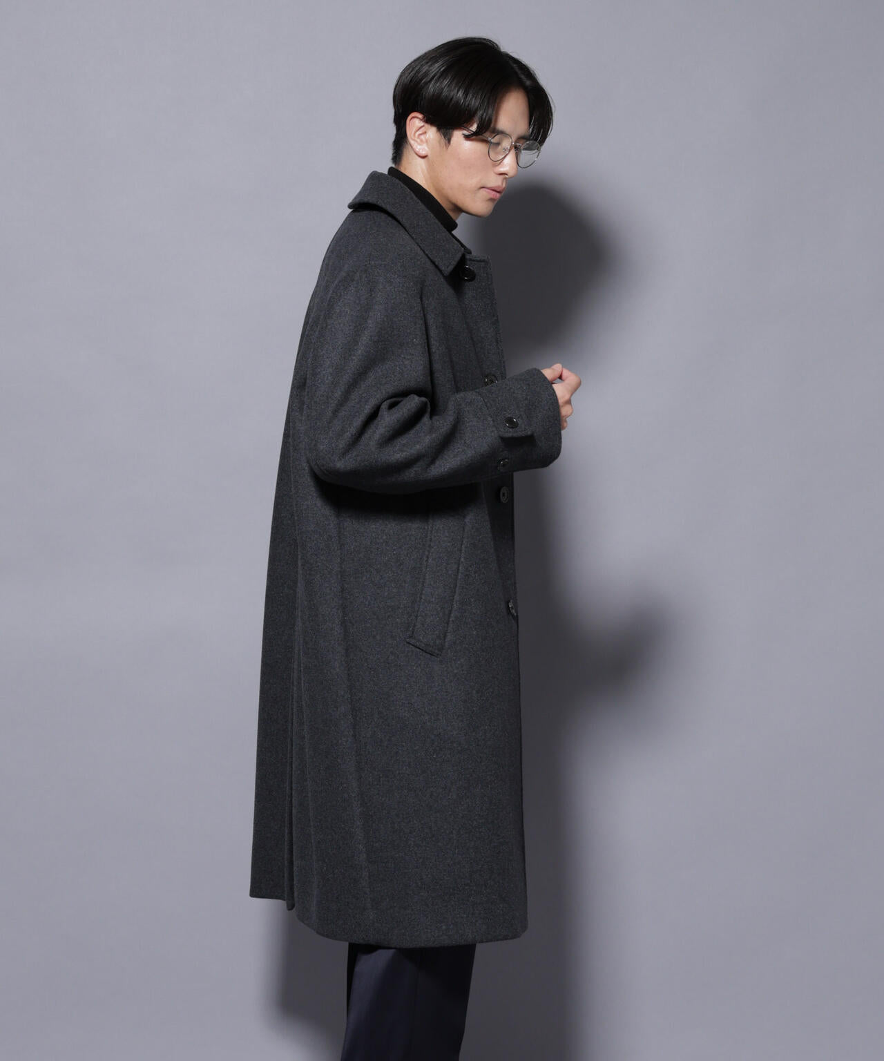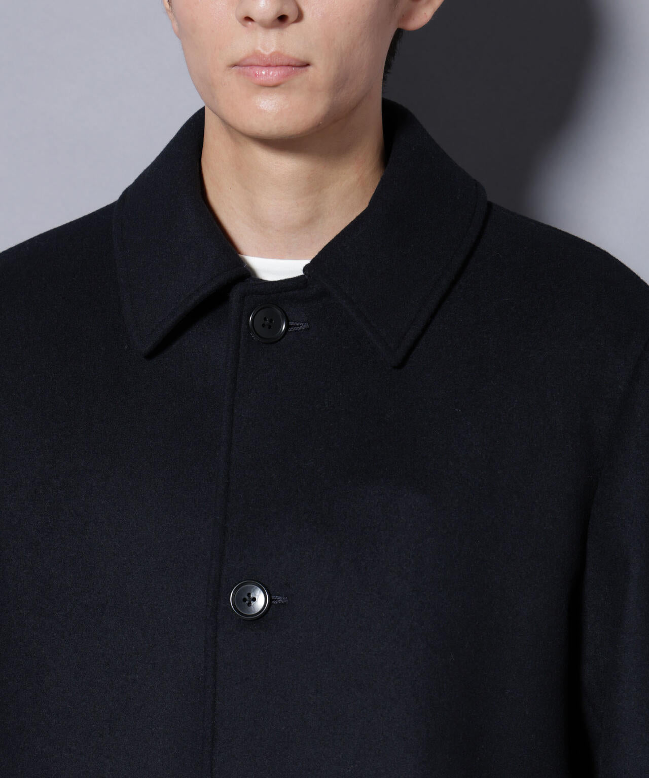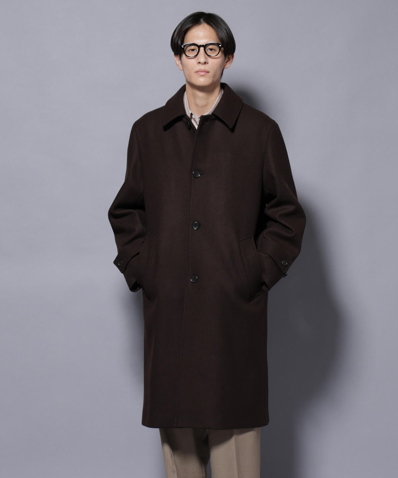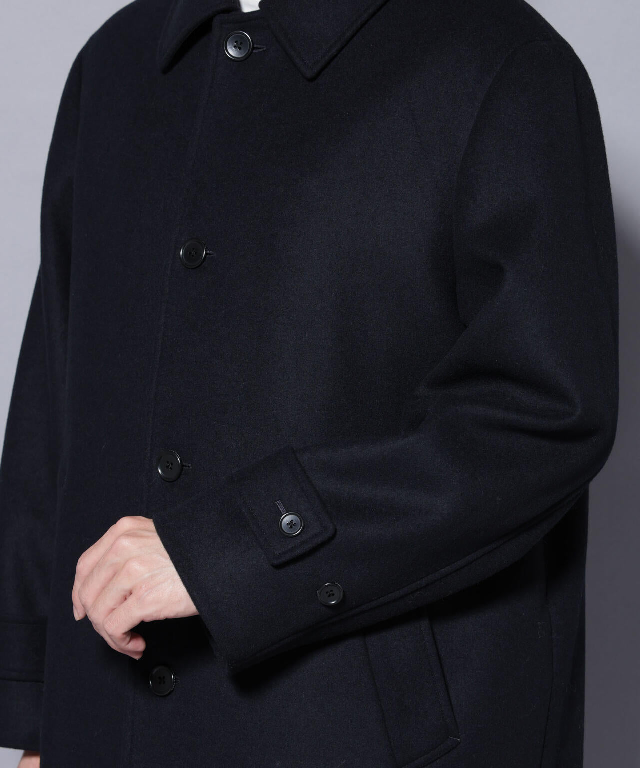 カシミヤミックスの上質な糸を使い、ふんわりとなだらかな肌触りで仕上げた、ナノユニバースオリジナルファブリックのソフトメルトンシングルコート。