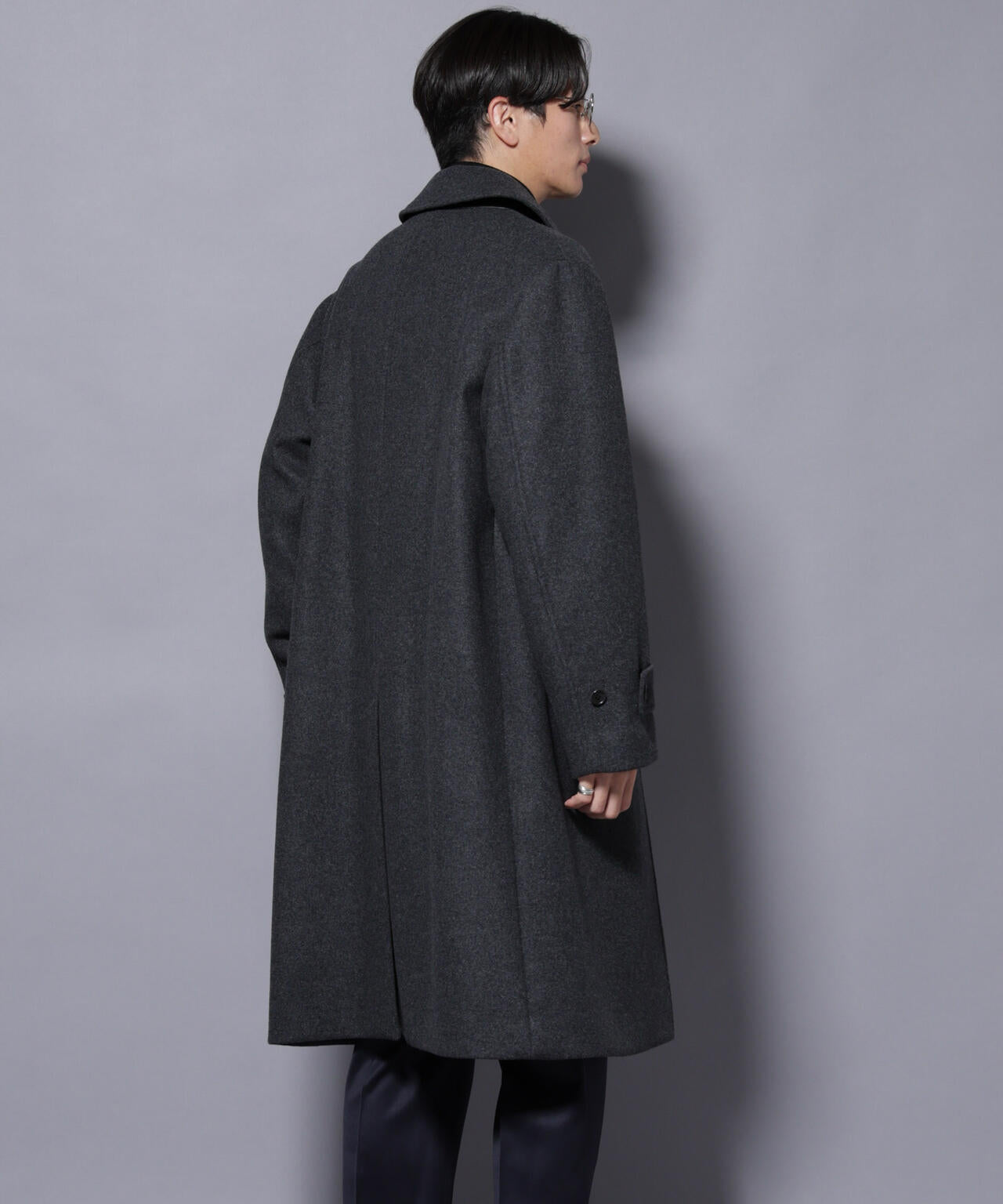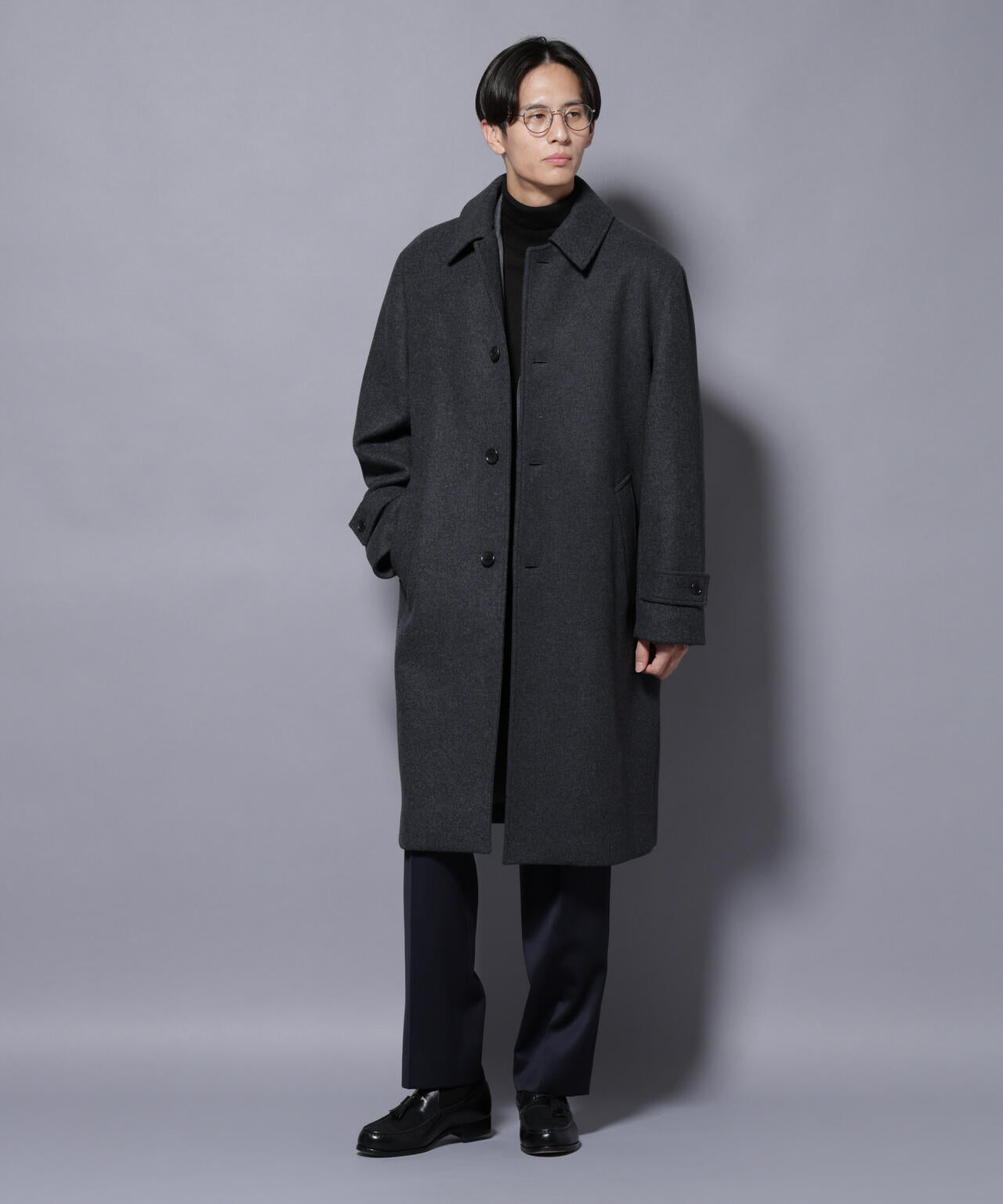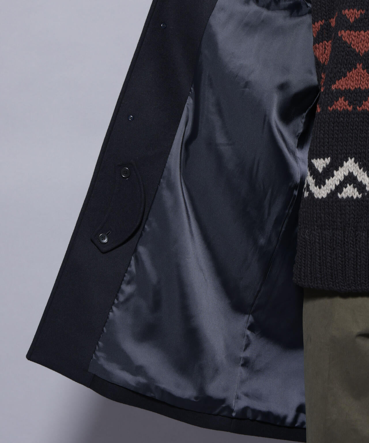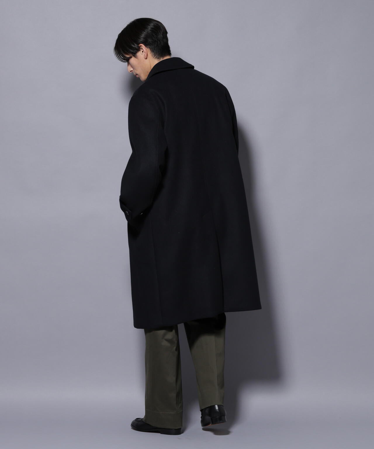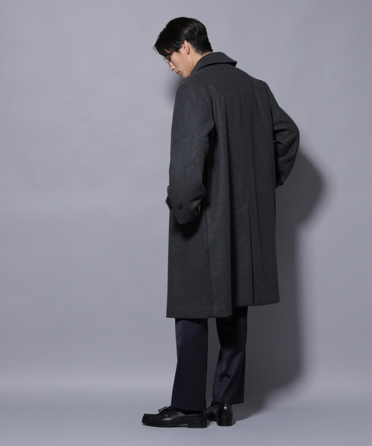 カシミヤミックスの上質な糸を使い、ふんわりとなだらかな肌触りで仕上げた、ナノユニバースオリジナルファブリックのソフトメルトンシングルコート。