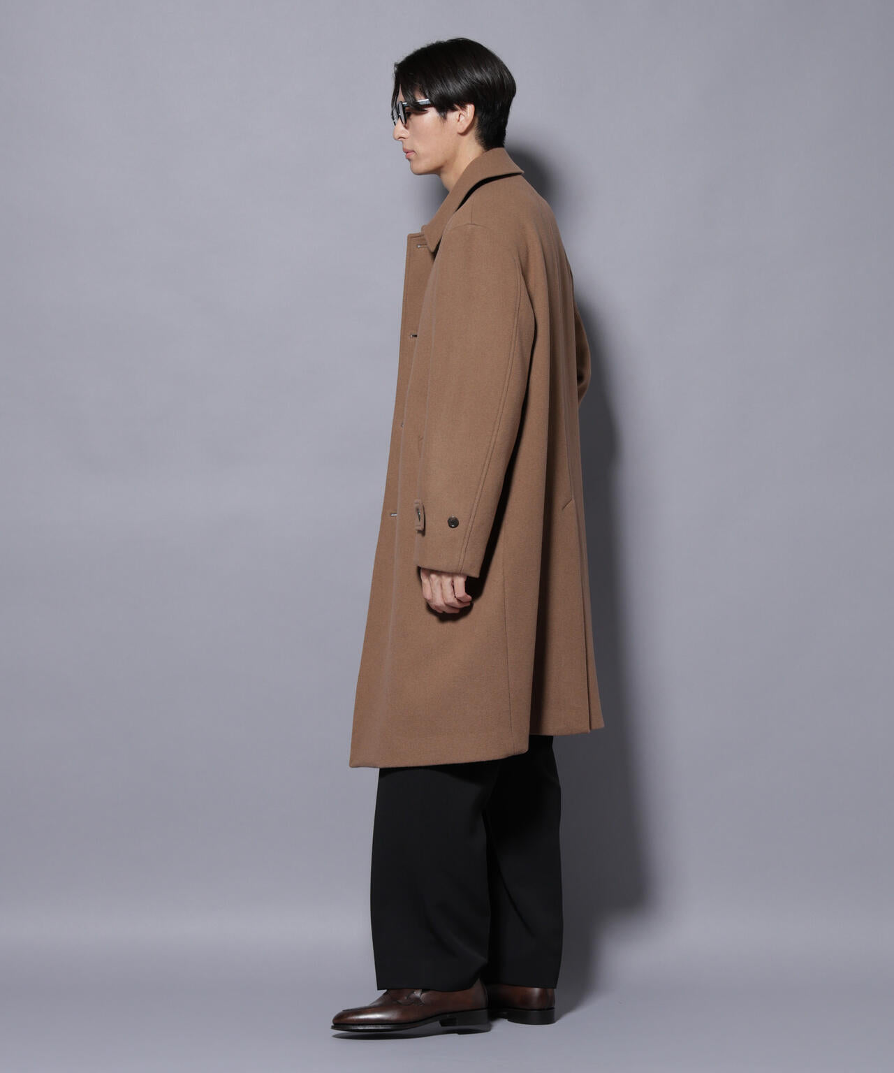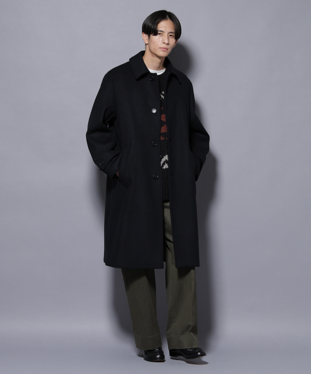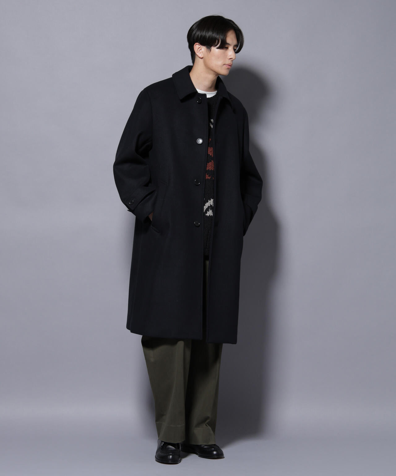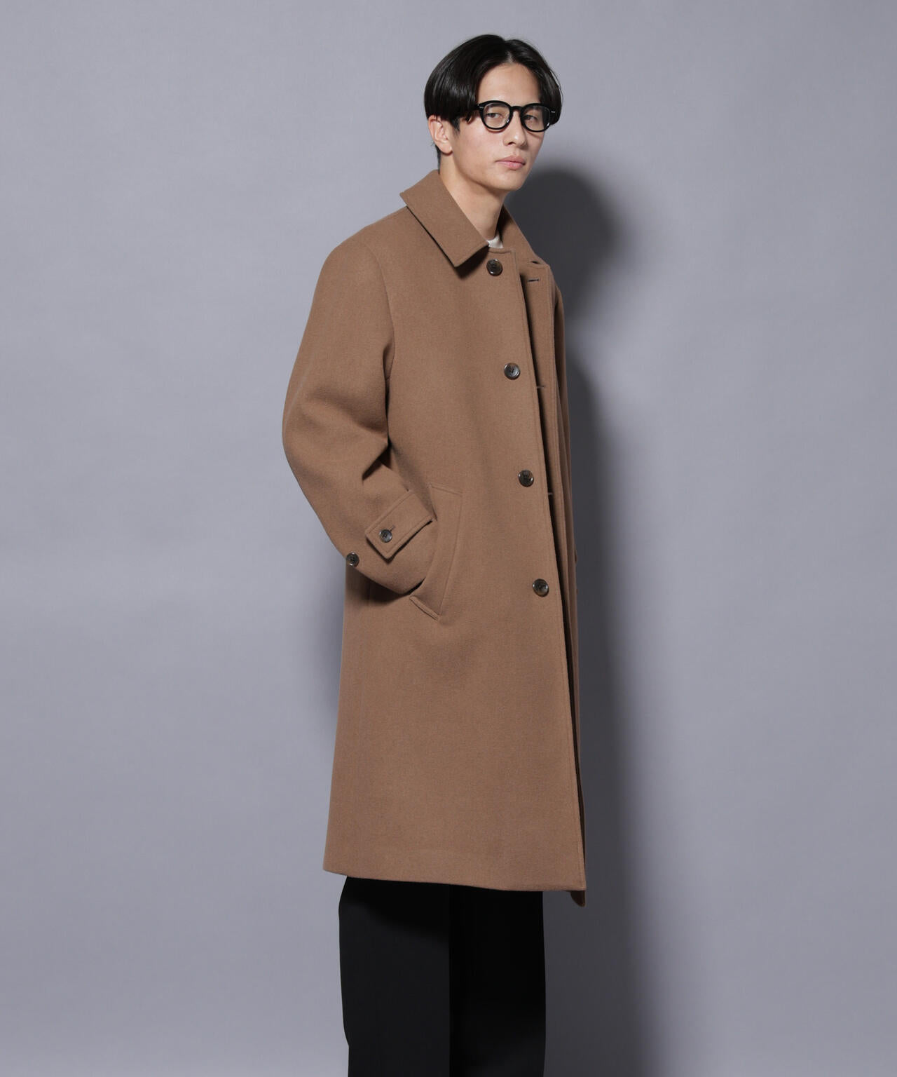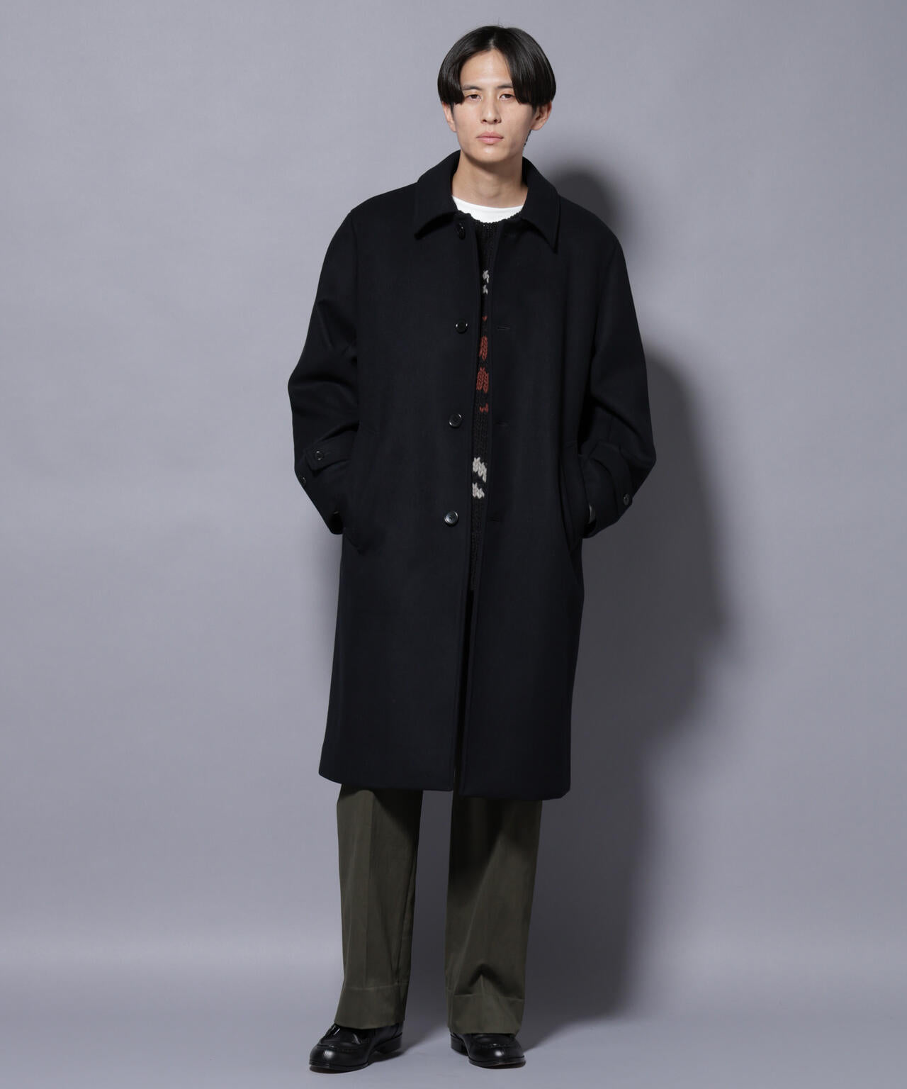 カシミヤミックスの上質な糸を使い、ふんわりとなだらかな肌触りで仕上げた、ナノユニバースオリジナルファブリックのソフトメルトンシングルコート。