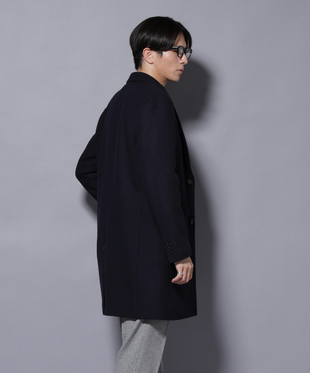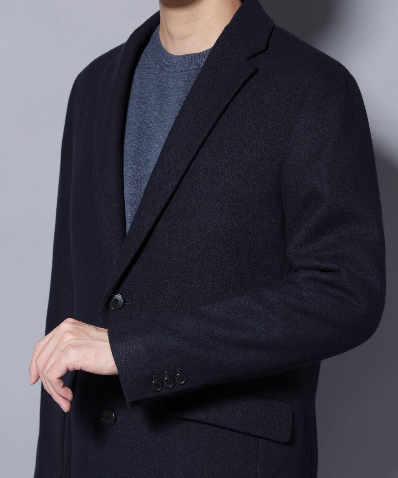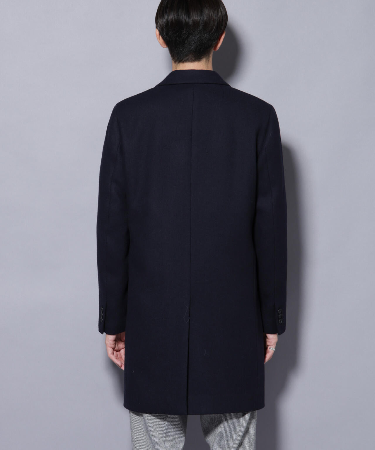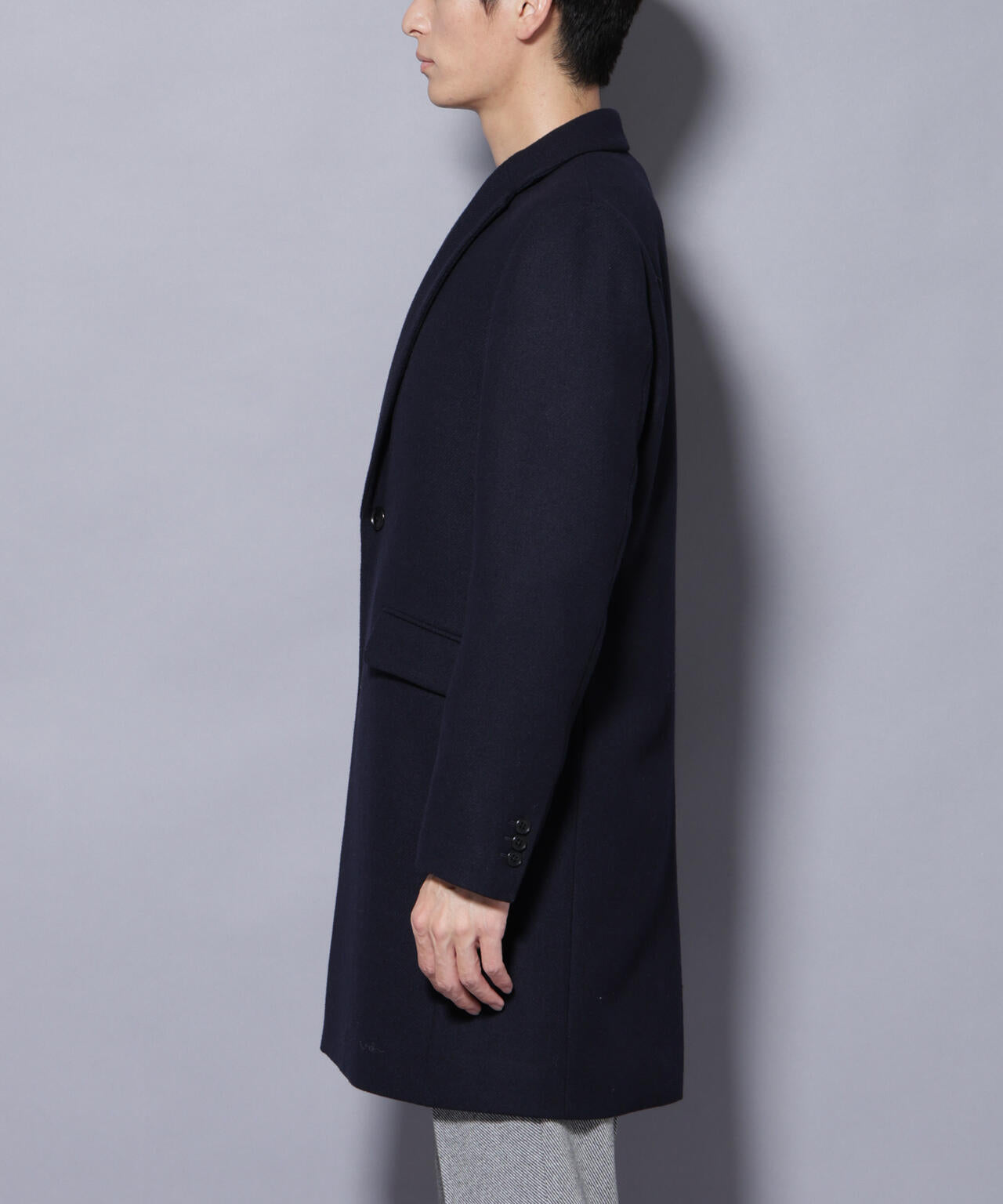 柔らかなウールブレンドメルトン素材で仕上げた、王道かつ洗練されたチェスターコート。細身でシャープなシルエットに、ややシェイプを効かせたウエストラインがスタイルをすっきり見せてくれる一着。ビジネスシーンはもちろん、休日のカジュアルスタイルにも活躍する汎用性の高いアイテムです。