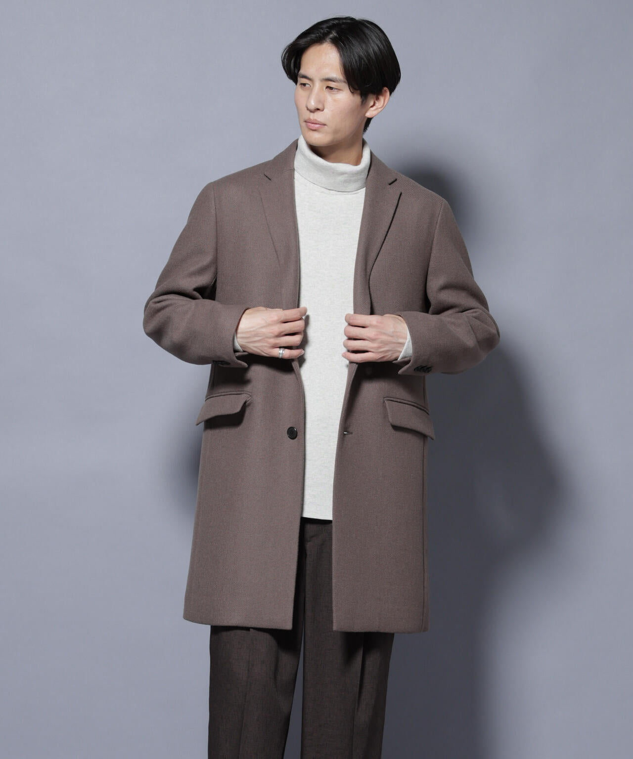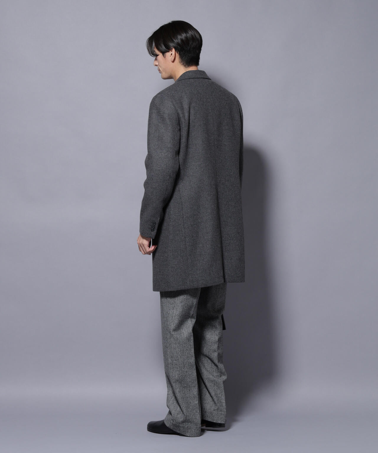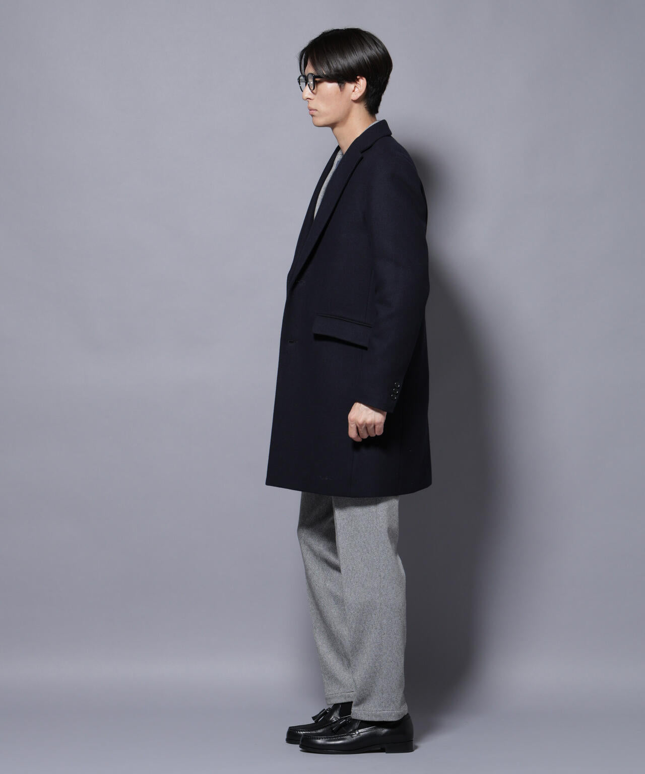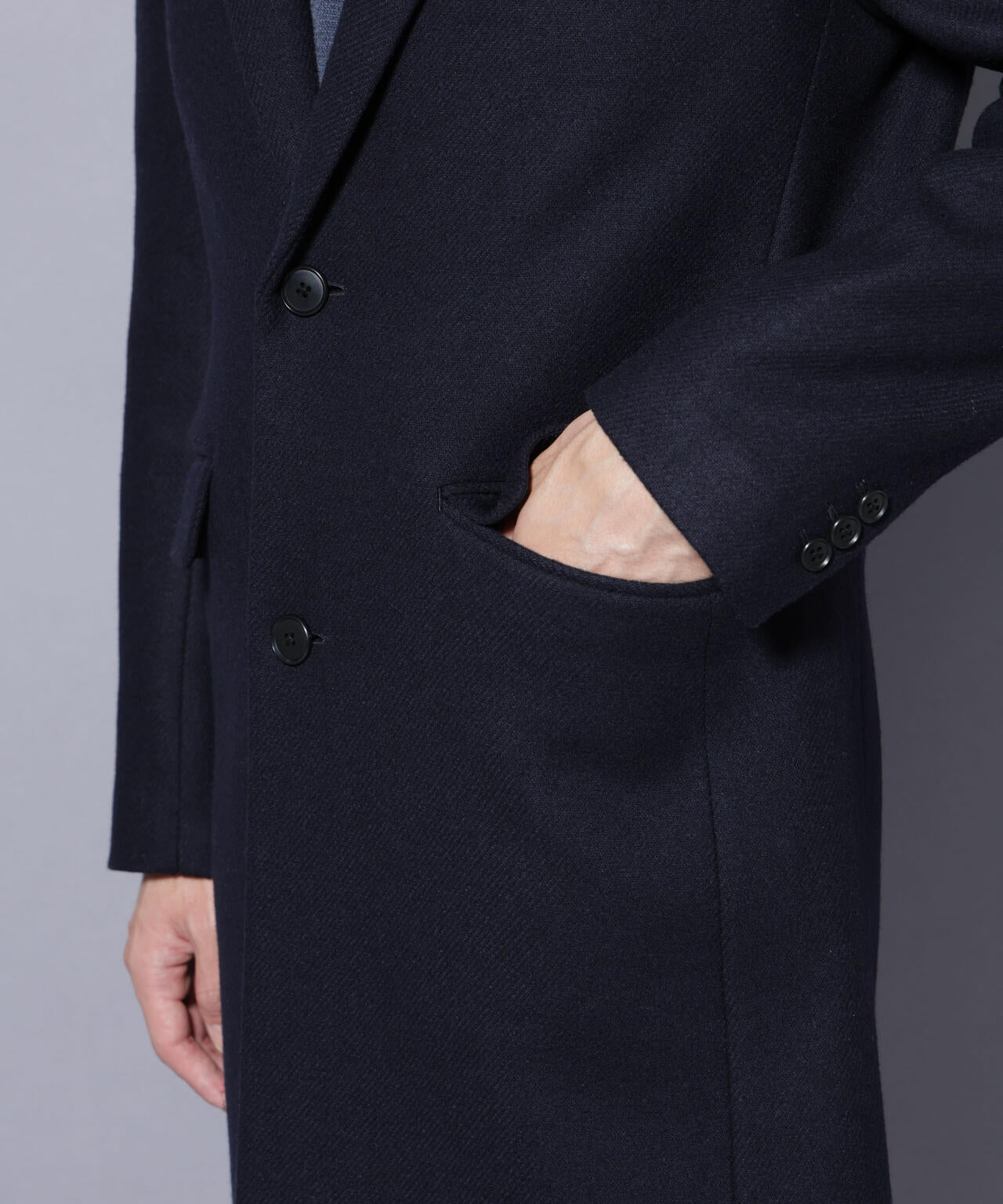 柔らかなウールブレンドメルトン素材で仕上げた、王道かつ洗練されたチェスターコート。細身でシャープなシルエットに、ややシェイプを効かせたウエストラインがスタイルをすっきり見せてくれる一着。ビジネスシーンはもちろん、休日のカジュアルスタイルにも活躍する汎用性の高いアイテムです。