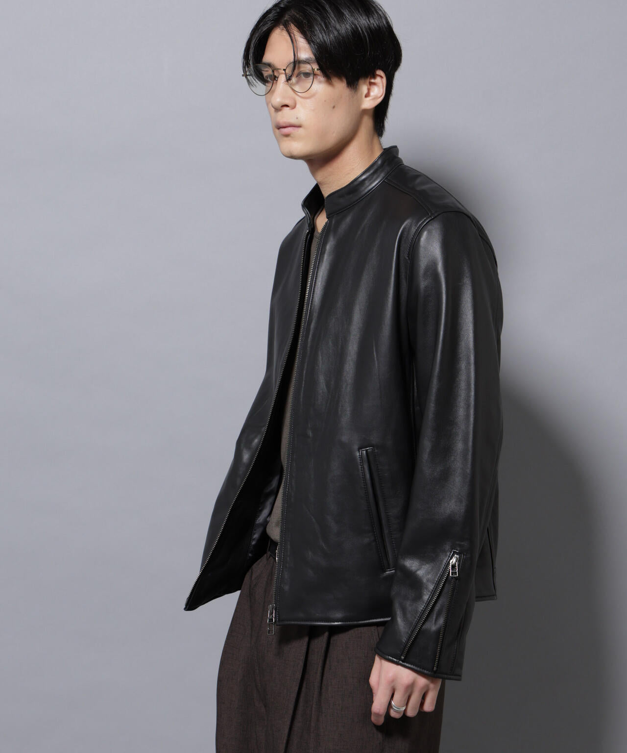 バンドカラーレザーシングルライダースジャケット