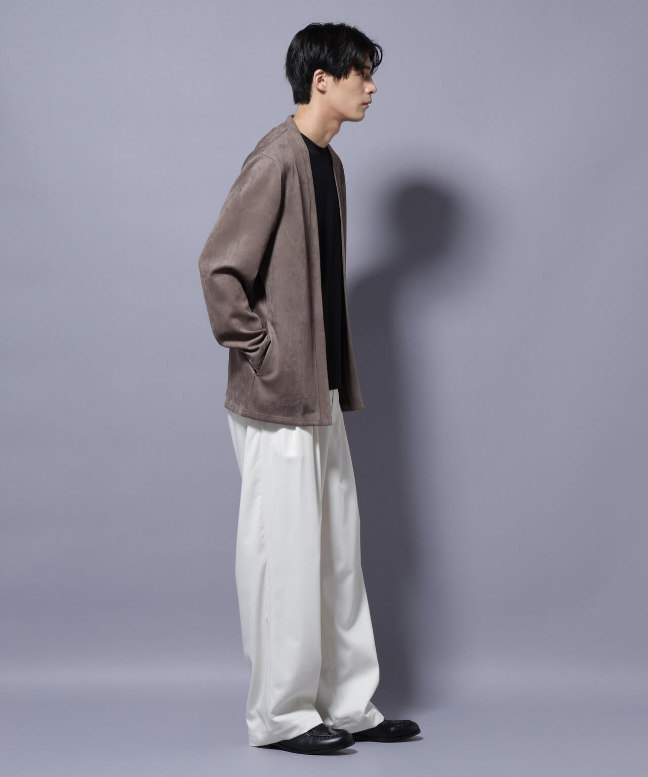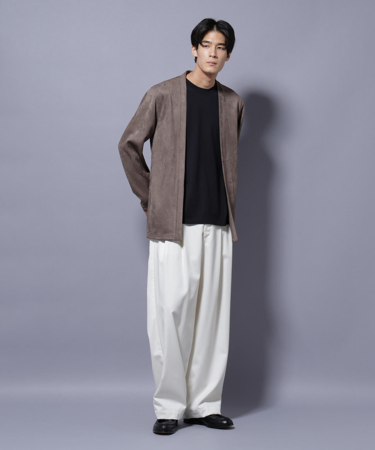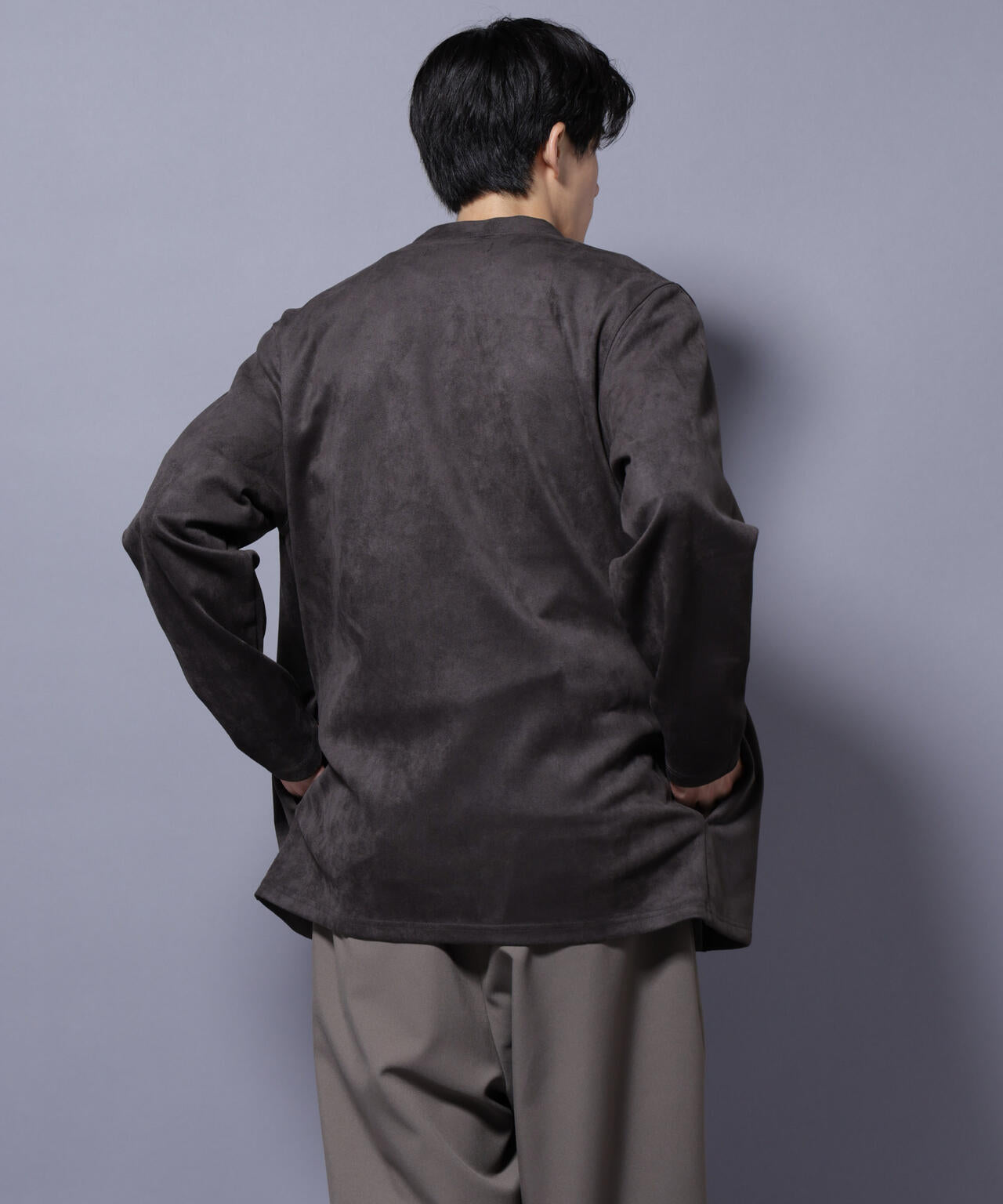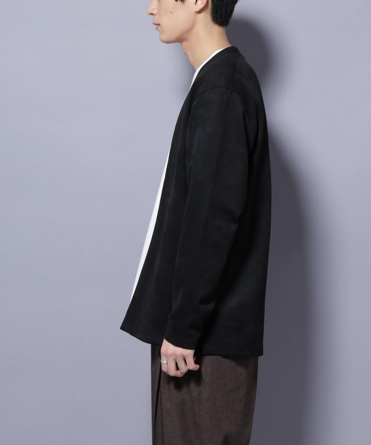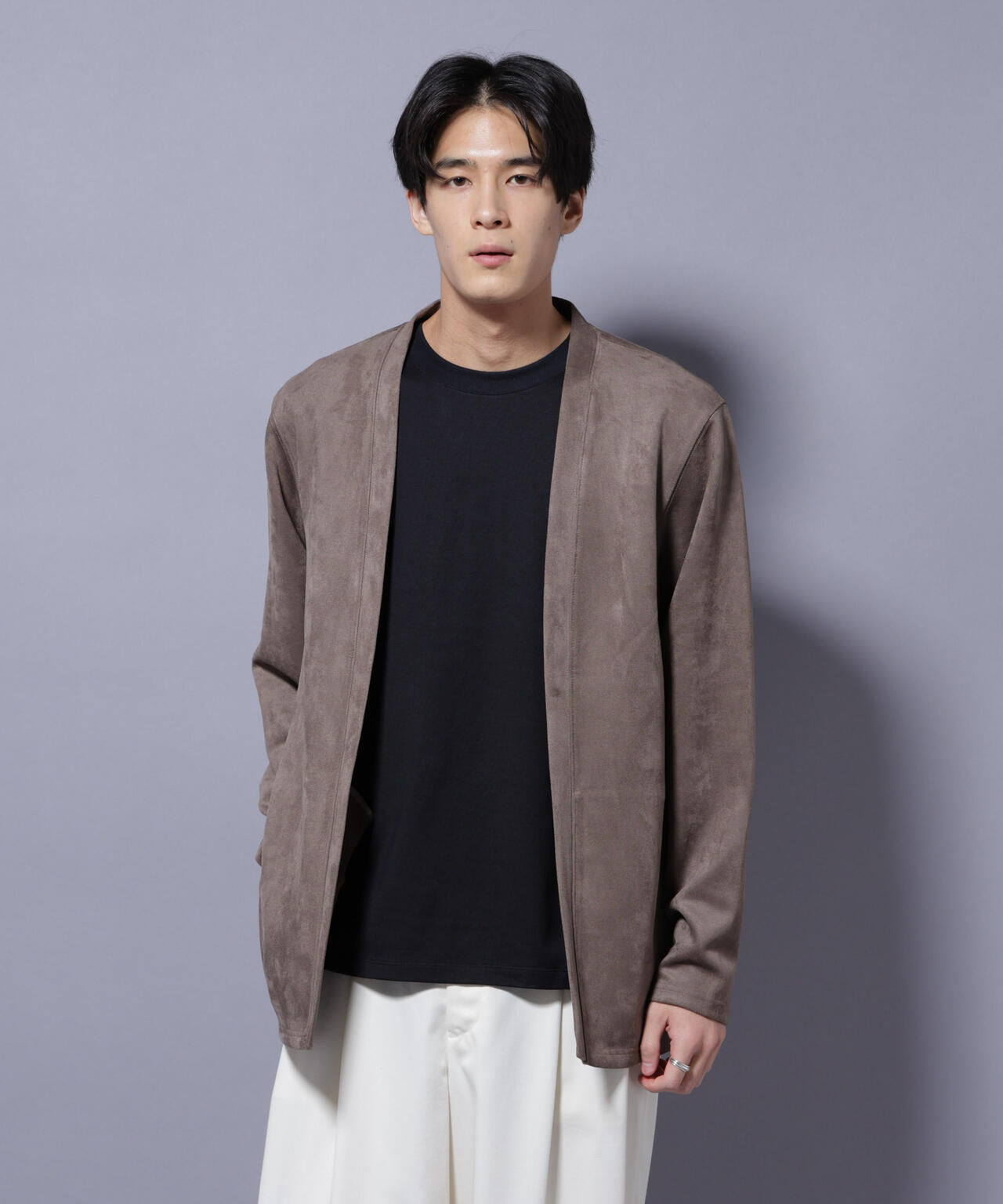 「フェイクスエード」シリーズから登場のトッパーカーディガン。伸縮性だけでなく、心地よいタッチ感を演出した生地を採用。軽い羽織としてもおすすめのアイテムです。