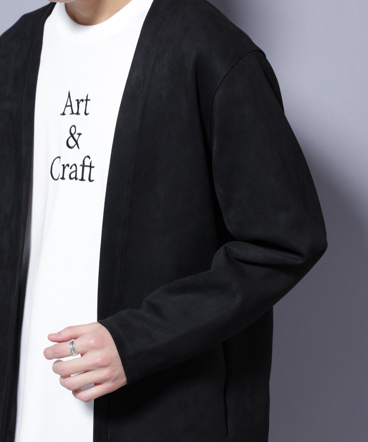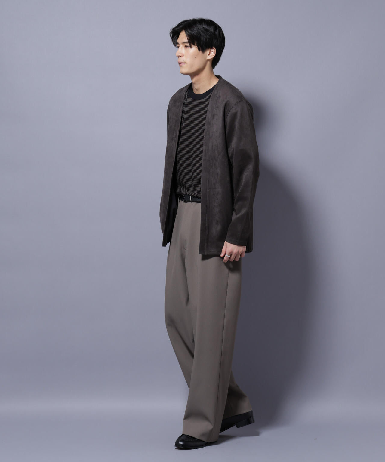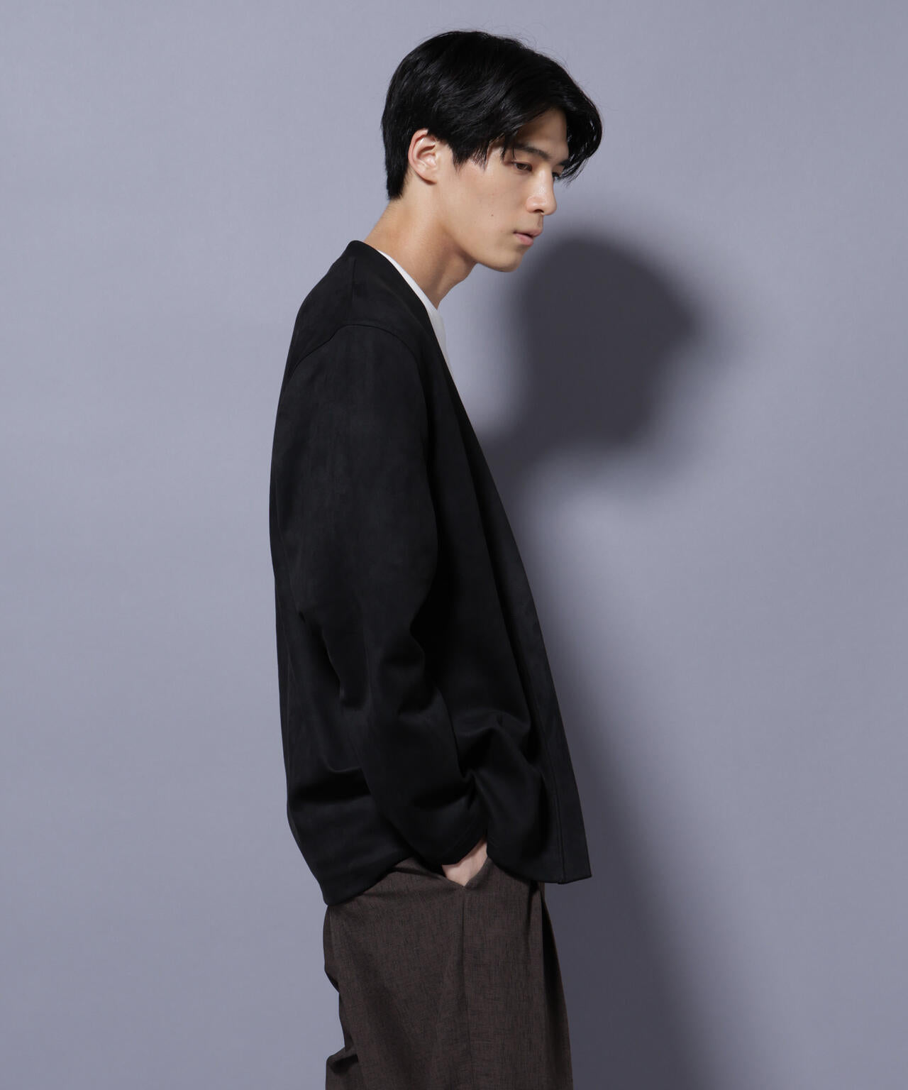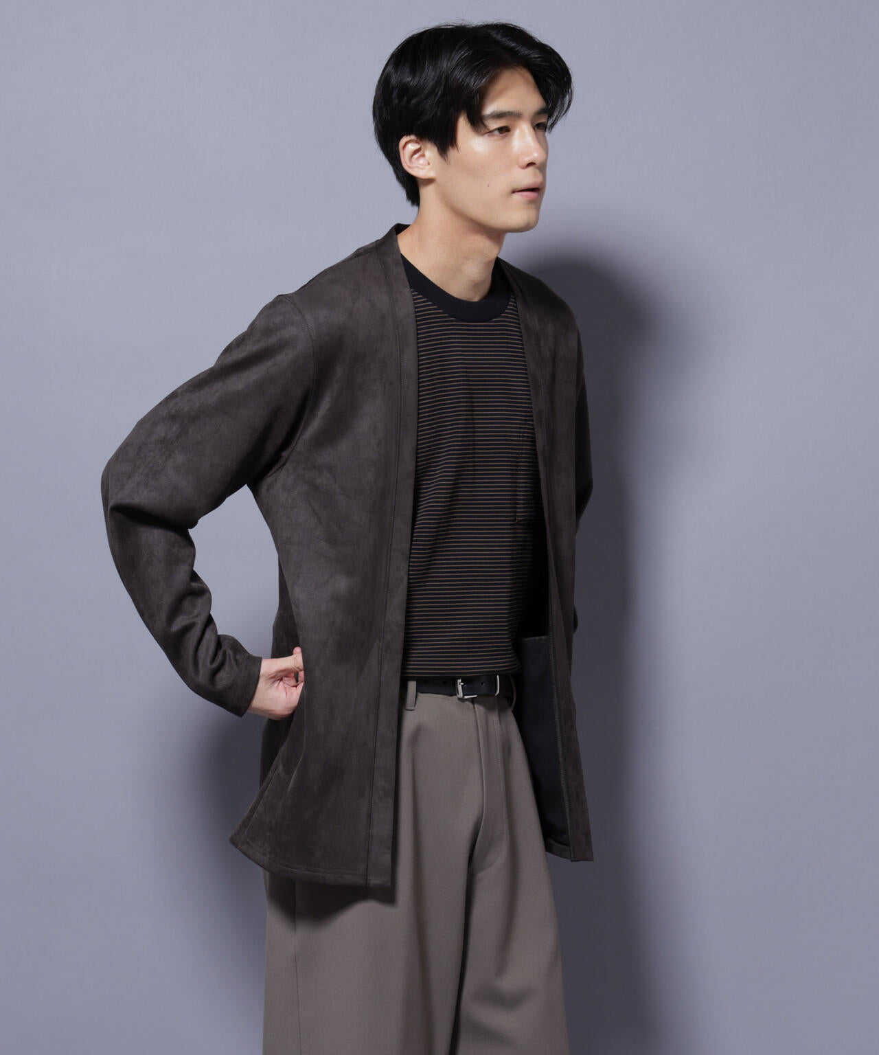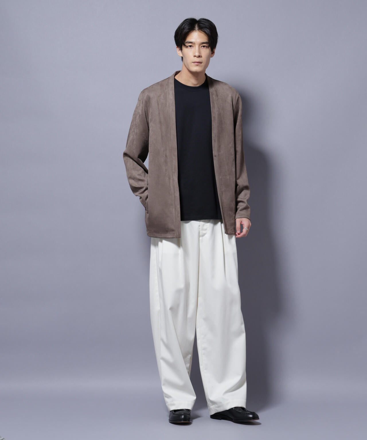 「フェイクスエード」シリーズから登場のトッパーカーディガン。伸縮性だけでなく、心地よいタッチ感を演出した生地を採用。軽い羽織としてもおすすめのアイテムです。